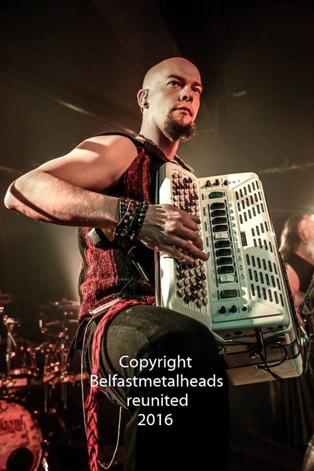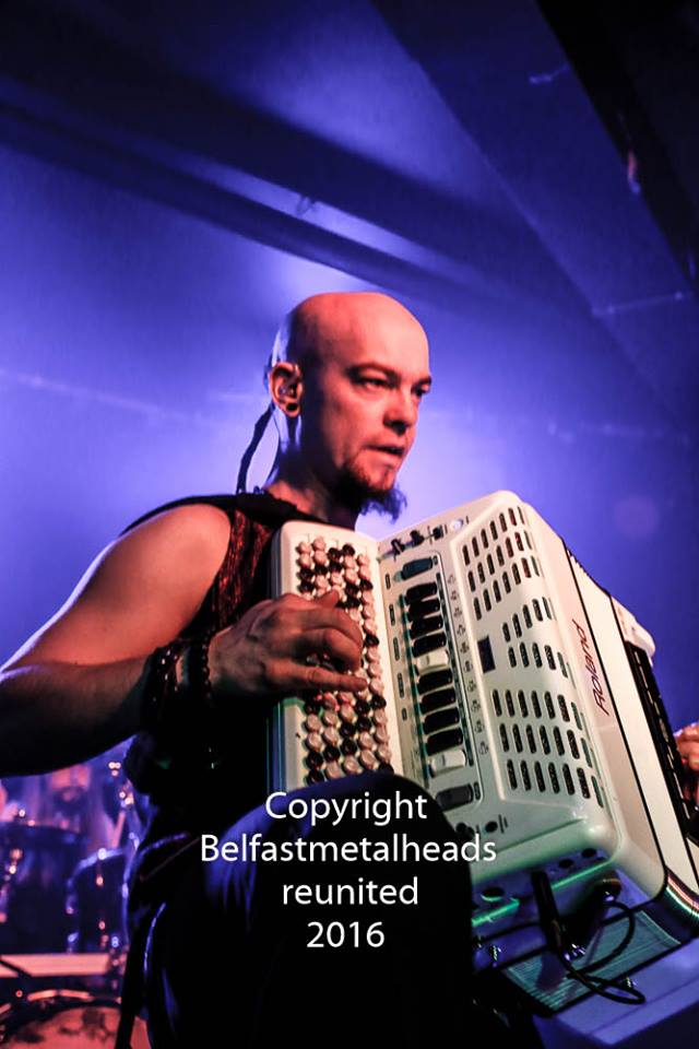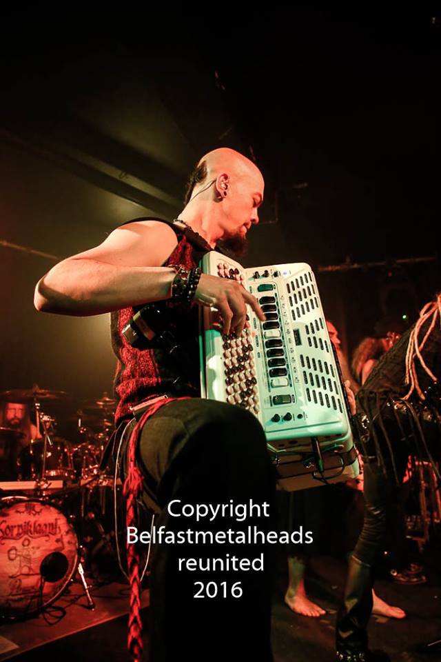 As to Korpiklaani, this is their second Belfast show in less than 18 months, and as they are about to take to the stage there is a sense of anticipation. In their previous incarnation, the band like Moonsorrow used synth sounds. Now, the accordion and electric fiddle not only give the band different tones, but provide three-dimensional visual elements to compliment Jonne as the focal point.